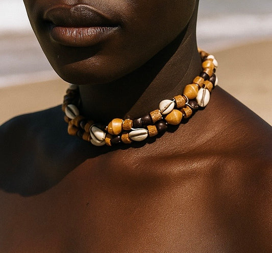 COWRIE SHELL AND WOOD SPIRAL CHOKER
