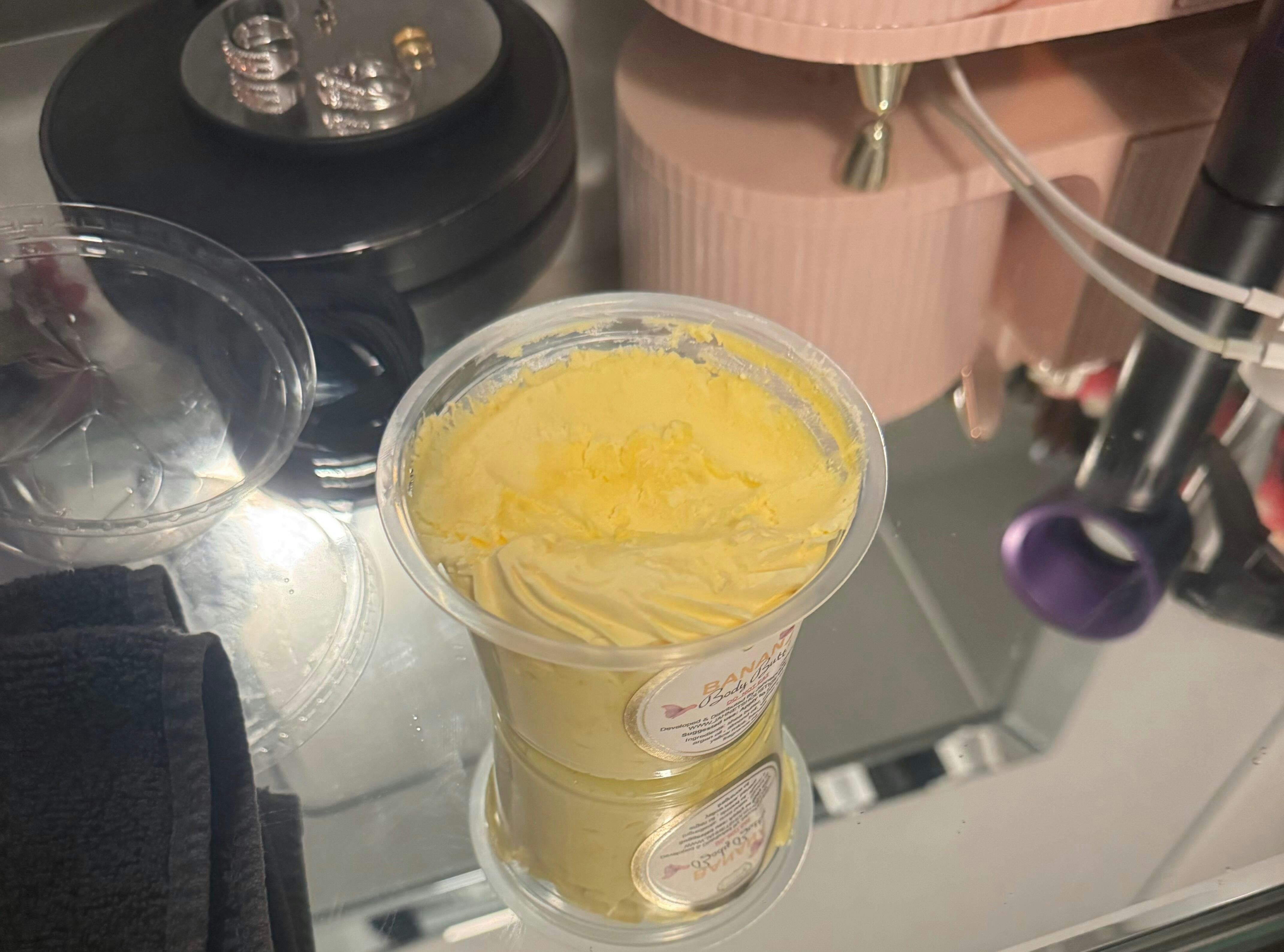 Shea butter, coconut oil, argan, oil, Almond oil, Vitamin E, Yellow mica, Banana fragrance oil